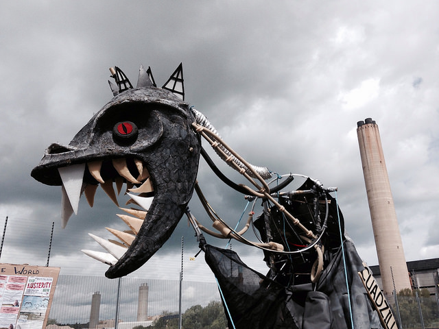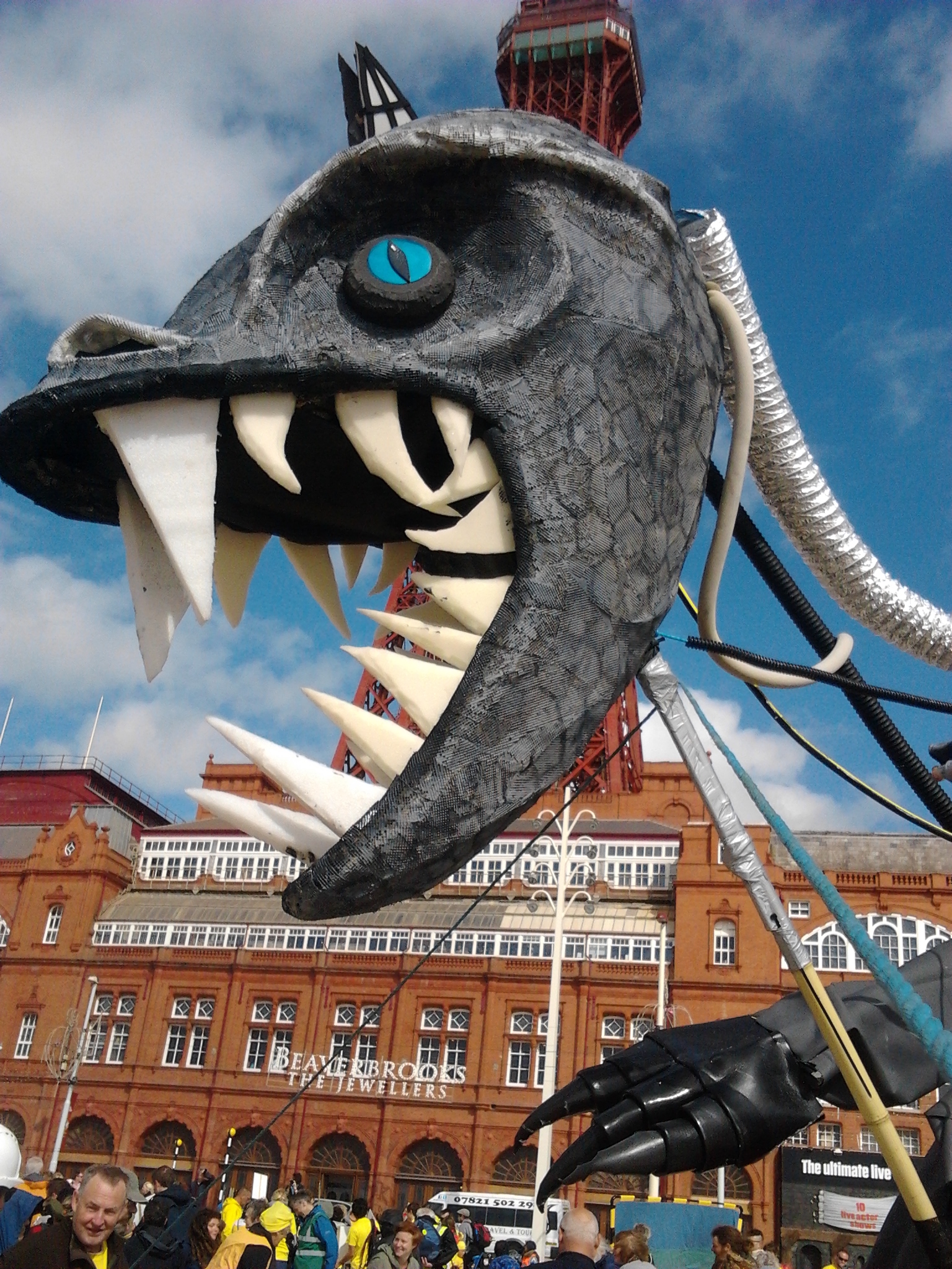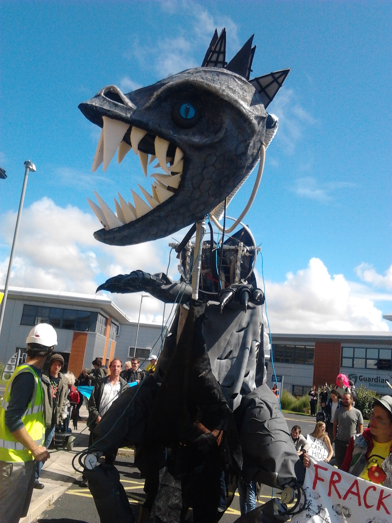 Cuadzilla was made to support anti-fracking campaigns, and made its first appearance in Blackpool, at Reclaim the Power in August 2014. It’s named after the infamous fracking company Cuadrilla, which caused the Blackpool earthquakes in 2011 and kept trying to frack in Lancashire and elsewhere until 2019. The puppet is a collaboration by Otherstory artists and Frances Howe.