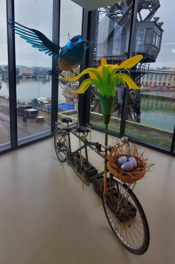 Its long curved bill reaches towards a flower – to drink the nectar. Its outstretched wings span about two and a half metres. On the front of the tandem is a nest with three pale blue eggs bearing the words: Peace, Land and Autonomy.