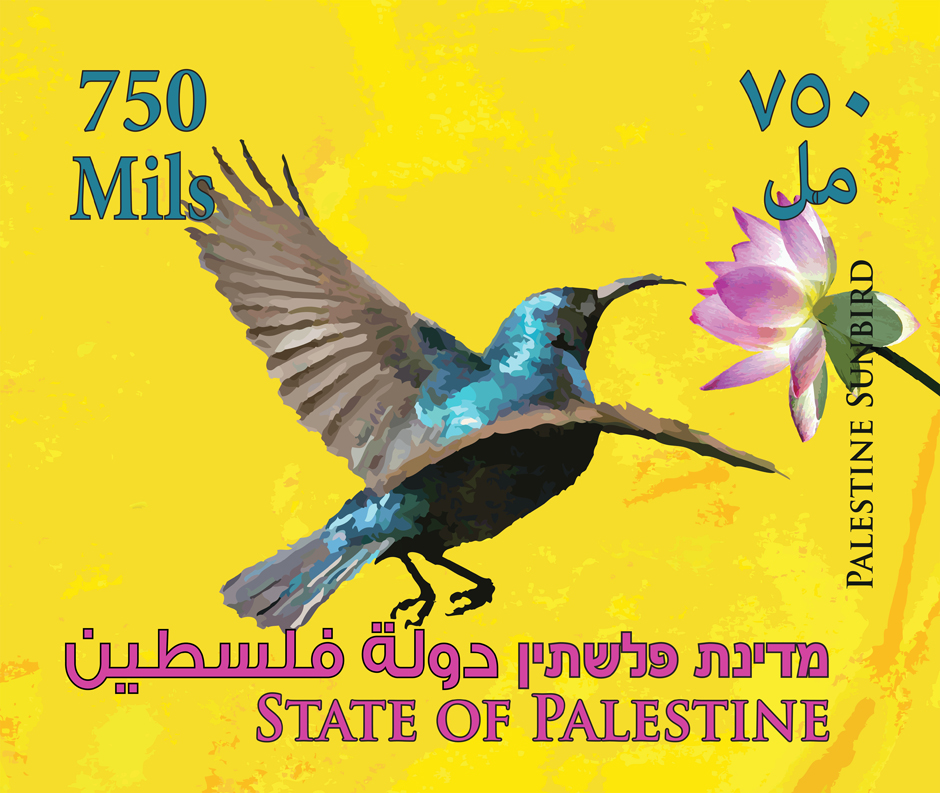 The artist Khaled Jarrar designed postage and passport stamps for the State of Palestine, using the Palestine Sunbird as the motif.