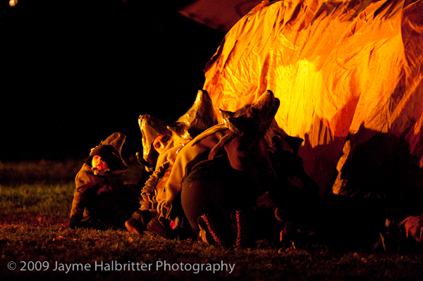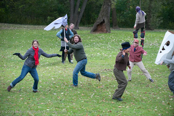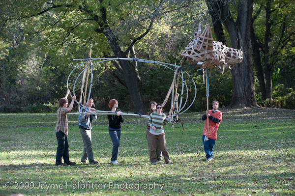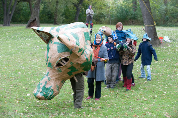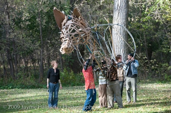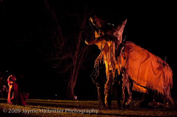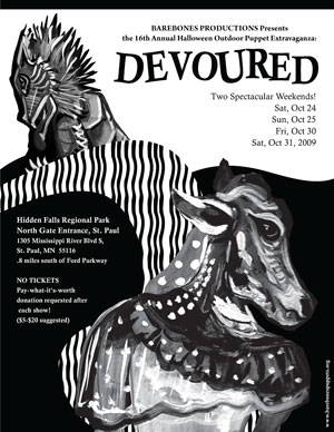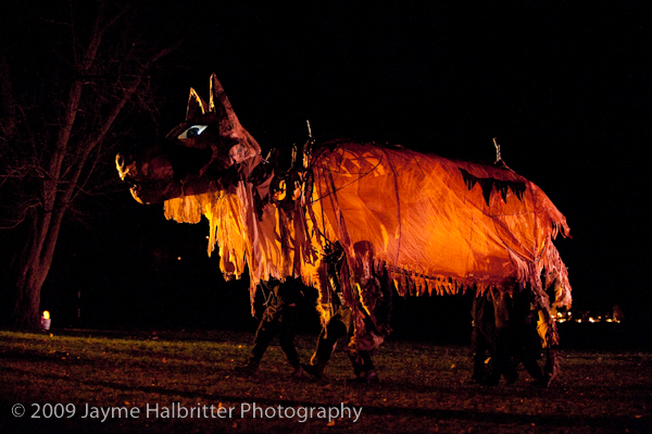 Scene with giant wolf and pups, in Devoured by Barebones Puppets , Hidden Falls Park, St Paul, Minnesota. Barebones’ Halloween Outdoor Puppet Extravaganza is a community-created pageant that honours the circle of life by honouring its seasonal arc of death in the fall.